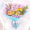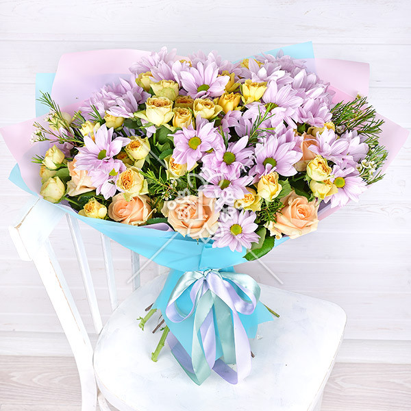 Роза кремовая (персиковая)-1шт, роза желтая кустовая –1шт., хризантема кустовая светло-сиреневая-1шт., хамелациум- 1шт.,  упаковка, лента.